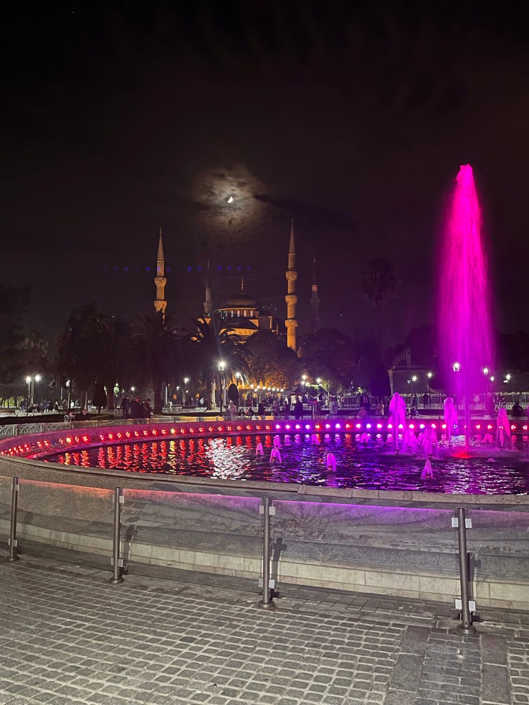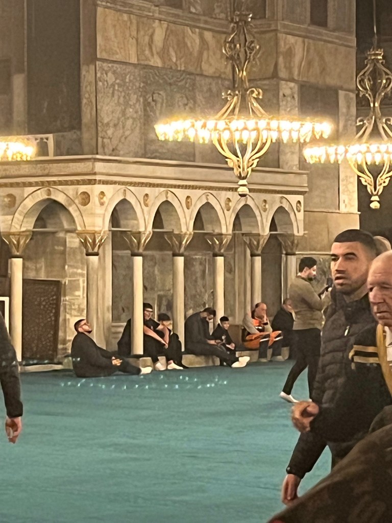 Finding our driver at the airport was quicker than the drive into town, however we were reminded of how big the airport was and the miles we had to walk down long corridors and walkways. Once again it was about 30 mins for the plane to travel from runway to gate. Our hotel is in the Sultanahmet area and the room big enough to open up both our suitcases. It’s also only a 5 min walk to the Blue Mosque so even though we were a lot later into our room than expected we walked up to the mosque on dusk and had a look. Unfortunately it is mostly closed and boarded up for renovations but we were able to have a peep inside. It was then over to Aya Sofya but the lines to get inside were massive and stationary as it was prayer time. We decided to leave it for another day but sat in the square for sometime eating I think our first donar kebab on the trip and watching the world go by. It’s busy and it’s crowded even though it’s end of the high season. There are lots of sprukers, gypsies, beggars, food carts and of course loads of cats and dogs. Possibly not as many cats as we have seen in the villages but still plenty. There are even vending machines in public squares were you can put in some money and get out (or leave out) a cupful of dog or cat food for the strays. The highlight of the night was going into a bar for an aperol spritz and while drinking it the barmen did a dance. The price for two drinks was about $45AUS – we decided it must have been a music/dance tax.